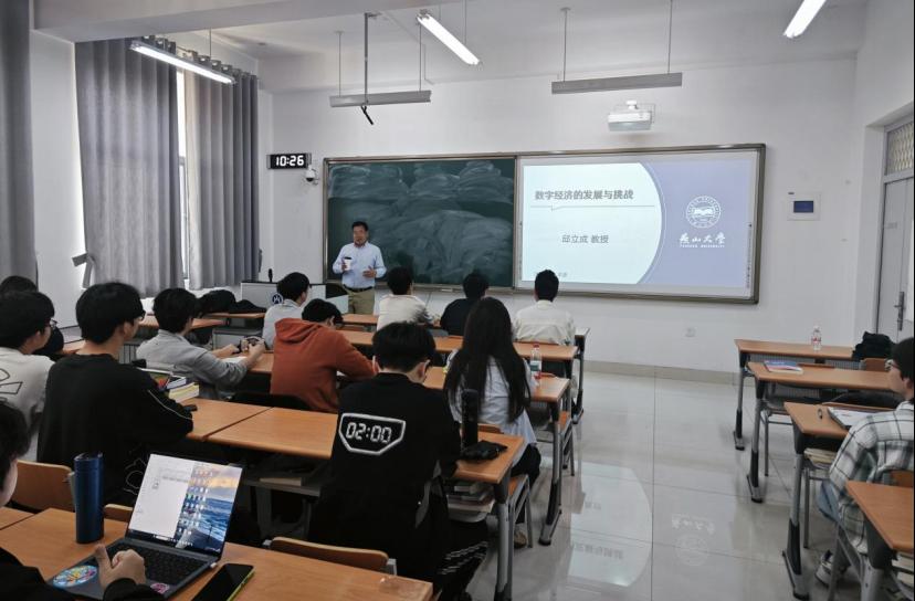 讲座中,邱教授介绍了中国数字经济的发展现状,分别从产业发展和国民经济等视角,剖析了数字经济的全方位影响。与学生探讨了制造业数字化转型的具体路径,及其对企业盈利模式的颠覆性变革。