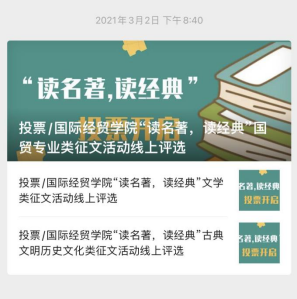 此次活动为学生提供了专业类、文学类、历史文化类三个类别的推荐书籍,并引导学生每天认真阅读并进行打卡,以撰写读书心得和研究报告提交阅读成果,参与全院范围的线上投票,最后产生了5名优秀作品,准备参与学校的评比。