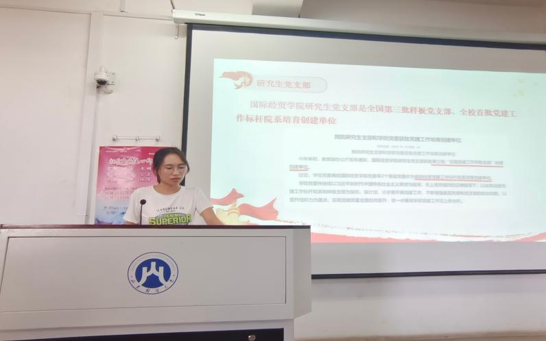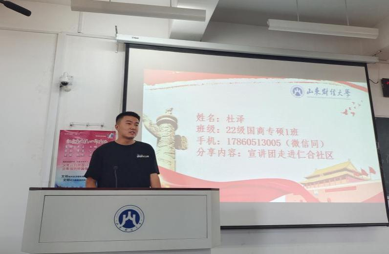 研究生党支部副书记、宣讲团成员欧炜瑶同志向新生们介绍了宣讲团的成立的背景、目的以及开展的相关活动。接着,蔡其龙和杜泽两位同志分别详细讲解了宣讲团走进舜耕中学和仁合社区两次宣讲,并分享了自己在备课中抓热点、解难点的体验和感悟,并希望可以有更多新力量加入宣讲团,用青年声音发出时代强音。