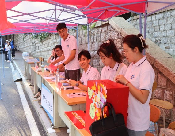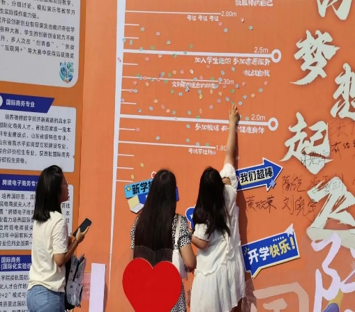 在舜耕校区和圣井校区的迎新现场,学院制作了宣传展板,详细介绍了学院概况、学科建设、学团工作、毕业生去向等内容,帮助新生进一步了解学院情况,同时为新生准备了“摸高挑战”、“心愿箱”等趣味活动,寓意学子们怀揣梦想奋力起跳,前程似锦。