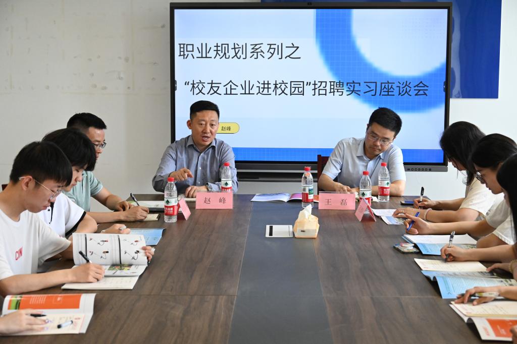 在座谈会上,赵峰校友与2022级学生代表围绕实习就业等主题进行深入交流。赵峰率先讲述了自己从母校毕业后的成长为企业高管的历程,分享了职场发展路径、行业趋势分析以及求职核心竞争力的塑造方法。他特别强调,在校期间的专业积累与综合能力拓展同样重要,主动适应企业需求、提前规划职业方向是赢得机遇的关键。李志同则从企业用人角度,详细介绍了山东华盛集团的国际化业务布局和人才需求标准。他指出,企业看重应聘者的国际视野、跨文化沟通能力和实务操作技能。他建议同学们在学好专业课程的同时,多关注行业动态,积极参与实习实践。在互动交流环节,同学们积极提问,围绕“如何提升求职竞争力”“行业发展趋势”“企业招聘偏好”等问题与赵峰校友进行了深入探讨。2022 级学生王启同表示:”这次座谈会让我对未来的职业方向有了更清晰的认识,学长的建议非常实用,尤其是关于如何准备面试和提升专业技能的部分,让我受益匪浅。”