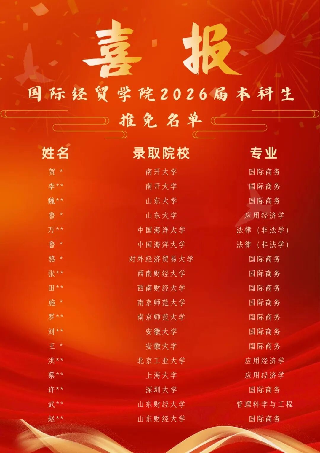 又迎来了属于青春的荣耀时刻——在2026年度推荐优秀应届本科毕业生免试攻读硕士学位研究生工作中,学院学子凭借过硬的综合素养,成功斩获南开大学、山东大学、对外经济贸易大学等多所国内知名高校的推免录取资格。这些学子通过大学期间不懈的努力,为自己的本科生涯交出了亮眼答卷。