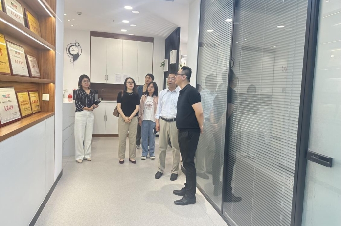 在澳利集团,学院师生一行参观了公司文化墙与业务版块展览。企业负责人、学院优秀校友姜勋、Max Wang分别介绍了企业的发展历程和外贸方面的主要业务,Max Wang回忆了在校期间参与的校园文化活动对自己能力成长的助力,特别是外语能力和执行能力,并表示愿意为学院在校学生提供实习岗位和就业机会,实现校企共赢。在交流中王斐斐表示,学院将继续加强学生英语能力和综合素质的培养,为企业输送业务能力强、综合素质高的外贸人才。