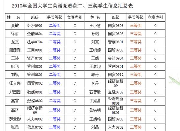 08级王小慧、孙诺、汪文惠、09级王婧翰、郭丹等人在2010年全国大学生英语竞赛中分获二、三等奖