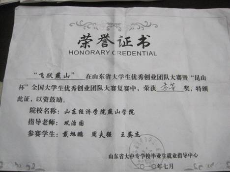 09级王英杰同学在‘昆山杯’全国大学生优秀创业团队大赛”中获得省级三等奖