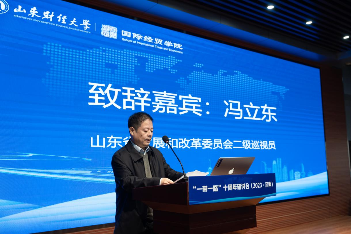 山东省发展和改革委员会二级巡视员冯立东厅长向与会人员发表了热情洋溢的致辞,并代表山东省发改委,对本次研讨会的举办表示热烈祝贺。他强调,世界经济形势并非一片大好,面临的严峻困难挑战不容忽视。因此,省委、省政府深入贯彻落实习近平总书记重要讲话、重要指示批示精神,坚定践行新发展理念,深入推进供给侧结构性改革,切实把习近平总书记的亲切关怀转化为“走在前、开新局”、扎实推进绿色低碳高质量发展先行区建设、奋力谱写中国式现代化山东篇章的强大动力。作为国家“一带一路”建设的重要“参与者”和“见证者”,十年来山东省在“一带一路”推进过程中一直都占有举足轻重的地位。因此,本次研讨会活动,围绕“一带一路”发展主题,着眼山东实践,不仅对国家层面的对外经济发展献言献策,同时也必将有力服务全省经济社会发展,契合时代大势、符合实践需要。