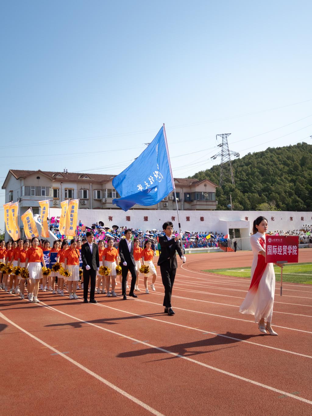 开幕式上,学院代表队昂首阔步,朝气满满,他们身着统一橘色上衣,精神焕发,目光坚定,面向主席台前,呐喊口号气势磅礴,院旗随节奏舞动,学院标语牌高高举起,以奋发昂扬的精神面貌彰显了国贸人学贯中西、胸怀天下的风采。