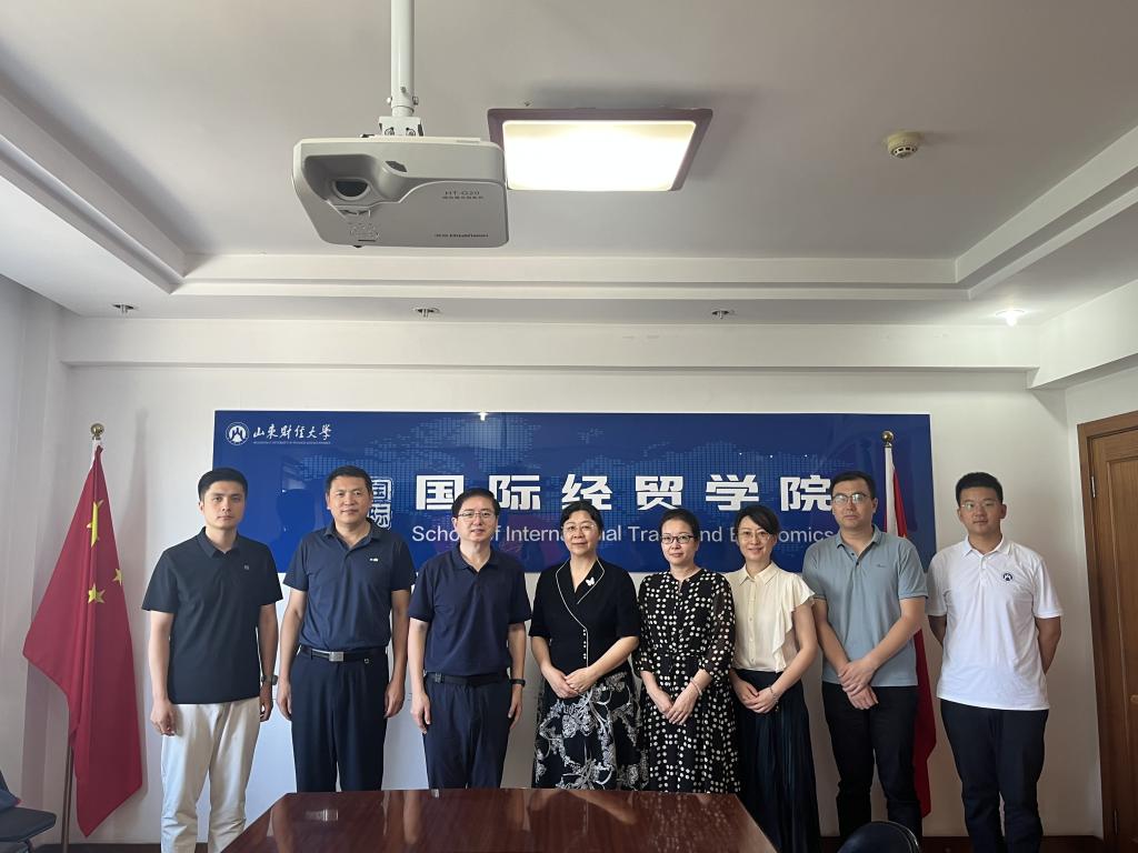 95级校友马光伟,山东省贸促会发展研究部二级调研员吕方涌和四级主任科员宋庆琛一行莅临我院交流座谈。国际经贸学院院长方慧、党委副书记王坤、团委书记李瑞雪、国际经济系主任李真、副主任赵胜立,跨境电子商务系主任房甄与来宾进行了座谈。