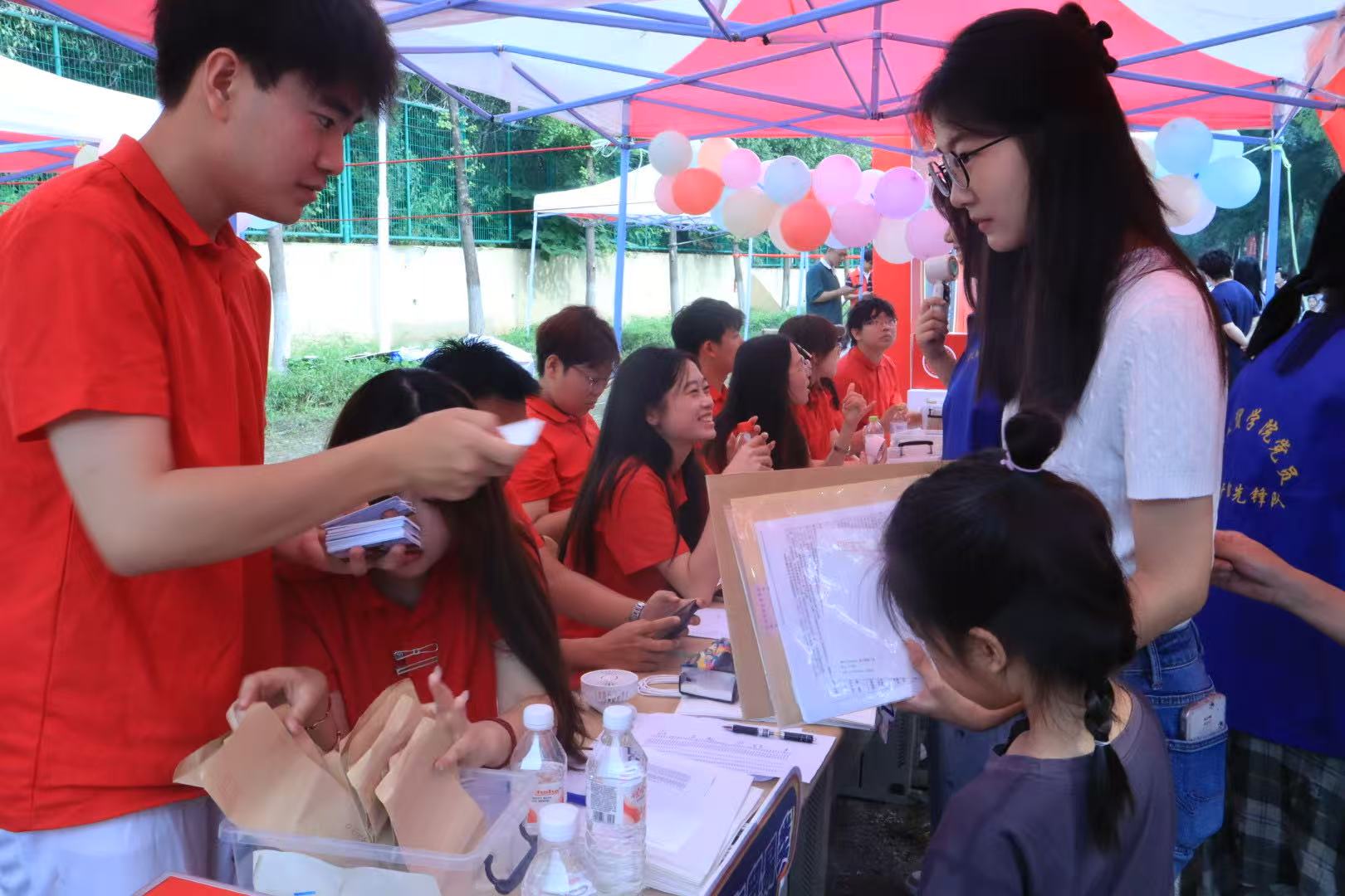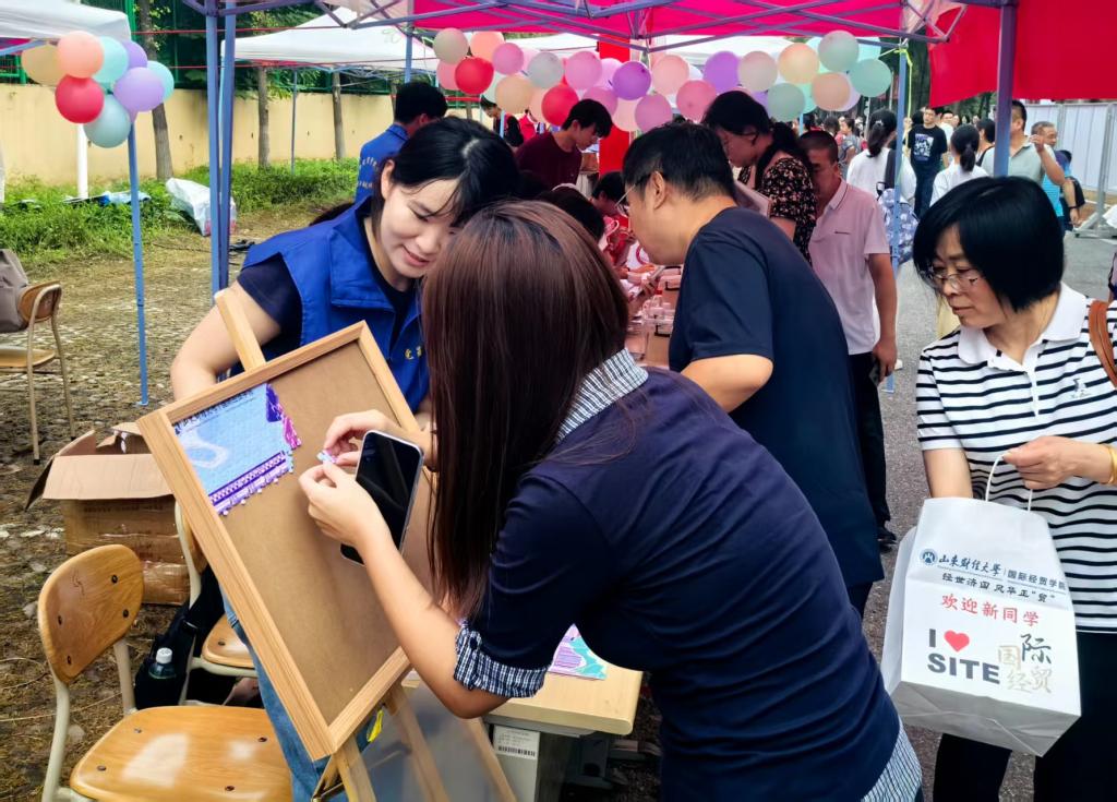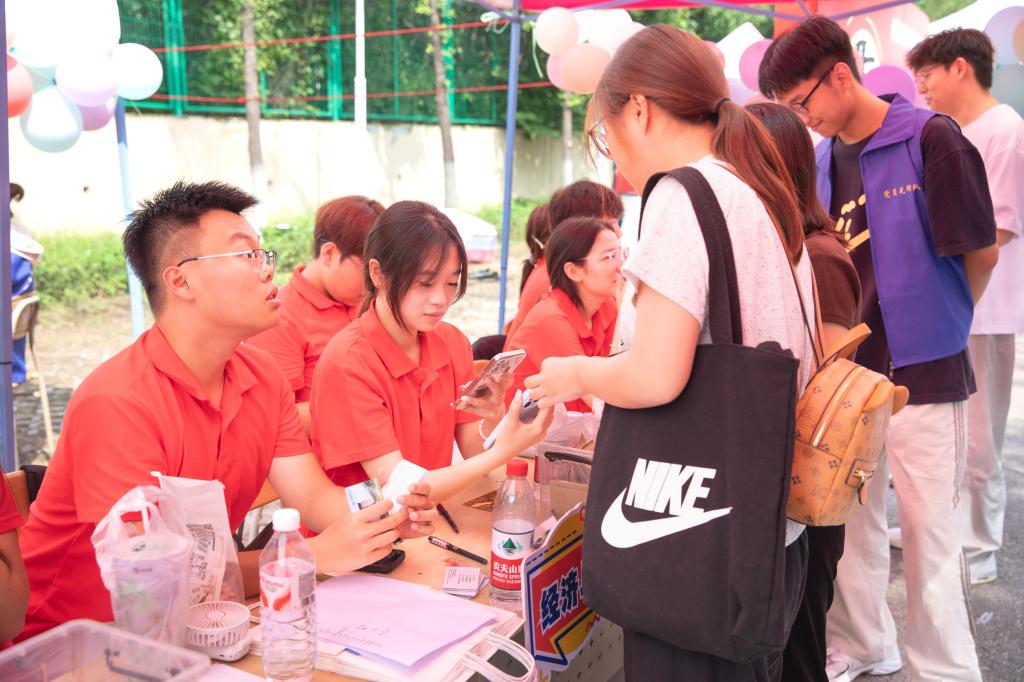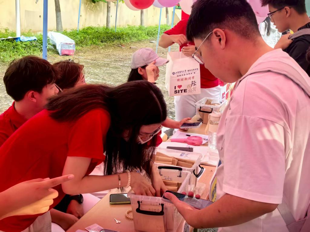 在迎新现场,学院制作了宣传展板,详细介绍学院概况、学科建设、育人成果以及毕业生升学就业等情况,助力新生进一步了解学院。同时,学院精心策划了多项特色互动活动,成为迎新现场的“人气焦点”。在“时光胶囊”活动区,新生们提笔写下对四年后的期许,交由学院保管,待毕业时再重启。“卡套盲盒”环节充满神秘色彩,新生从抽奖盒中抽取印有学校特色标识的校园卡卡套以及限量版“隐藏款”卡套,收获意外惊喜。“校园拼图”活动中,新生将领取到的拼图拼在画架上,最终合力完成一张完整的校园地图。这些迎新创意活动充分展现了学院的热情与真诚,让每一位新生都拥有满满的归属感,帮助他们更好地融入学院。