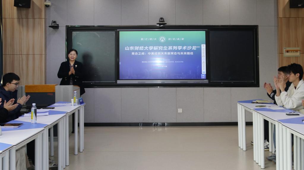 研究生系列学术沙龙第三期活动在舜耕校区举行。本期沙龙采取产学研联动形式,主题是“竞合之间:中美经贸关系新常态与未来路径”。来自山东理工大学的李平教授、香港麦家荣律师事务所驻济南代表处王巧莲主任应邀参加并作主题发言,新澳六合彩