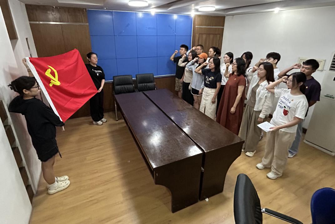 强党性、勇担当。为进一步强化党性意识、坚定理想信念,7月1日下午,研究生党支部举行重温入党誓词仪式。活动在庄严的《国际歌》声中拉开帷幕,全体党员身着正装,佩戴党员徽章,精神饱满地齐聚一堂,面对鲜艳的党旗,高举右拳,庄严宣誓:“我志愿加入中国共产党,拥护党的纲领,遵守党的章程……”铿锵有力的誓言响彻会场,表达了党员们对党的无限忠诚和为共产主义事业奋斗终身的决心。党员们纷纷表示,此次活动让自己更加深刻地认识到肩负的责任和使命,要把入党誓词内化于心、外化于行,发挥先锋模范作用,为推动学校高质量发展和建设社会主义现代化国家不懈奋斗。