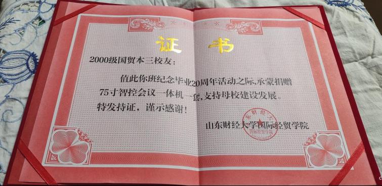 2000级3班的校友们齐聚一堂,庆祝毕业20周年重聚。2000级本科3班校友为感谢母校培养,特别为学院捐赠75寸智控会议一体机一套,用于学院各类教学及会议活动,捐赠活动在燕山校区举行,学院党委书记崔东峰参加捐赠仪式,崔书记对校友们返校表示热烈的欢迎,感谢校友支持学院教育事业的发展,改善学院的教学设施,为老师和学弟学妹们创造更好的工作学习环境。仪式上大家共同观看了学院拍摄的70周年校庆纪念片,校友们齐聚一堂,共话当年。仪式结束后,大家去东苑餐厅吃回忆餐,感受校园生活的氛围,餐后参观了海岱美术馆。校友们纷纷表示,学校生活条件大幅改善,文化氛围愈发浓厚,表达了对母校未来的美好祝愿,希望通过更多的合作与支持,为学院的发展贡献力量。