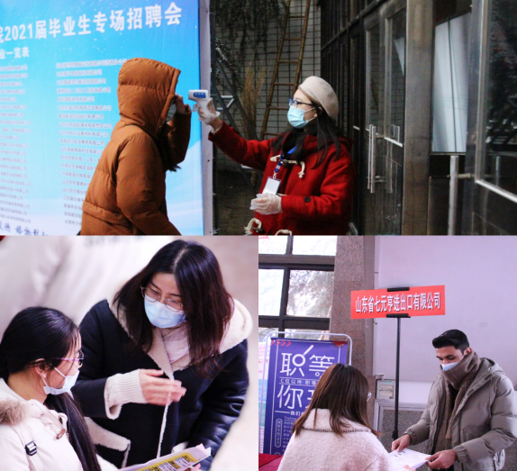 本次招聘会由学院和就业处共同举办,省跨境电商协会和阿里巴巴科技有限公司山东分公司协办。本着防疫工作与就业工作并重的原则,学院与就业处事先进行了周密的准备并制定了相应预案:对招聘单位进行了筛选,在报名的120余家单位中挑选了62家单位前来参会,婉拒了近一半的报名单位;通知凡有中高风险区旅居史或与有中高风险区旅居史的人有接触者或其他不符合防疫要求者一律谢绝参会;参会企业代表报到时需提交健康承诺书并凭健康码绿码方可入校入场,入场需科学佩戴口罩;学生分时段入场;所有入场者均需先测量体温等,确保防疫工作万无一失。